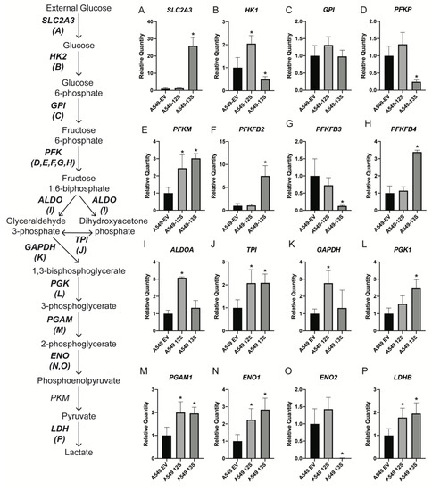 Relative expression levels of mRNA for glycolytic genes in 13S and 12S expressing A549 cells. The mRNA expression for 16 genes encoding components of glycolysis were measured with qPCR (A–P). A549-13S cells had higher expression of nine genes (A,E,F,H,J,L,M,N,P) and lower expression of four genes (B,D,G,O) when compared to A549 cells expressing an empty vector. A549-12S cells had higher expression of eight genes (B,E,I,J,K,M,N,P) when compared to A549-EV cells. The combination of differential mRNA expression in the A549-13S cells may contribute to their unusual glycolytic phenotype. H2AFY was used as a reference gene. Asterisks (*) indicate p < 0.05. n = 3 per group for all panels. SLC2A3, Solute carrier family 2 member 3; HK, hexokinase; GPI, Glucose-6-phosphate isomerase; PFKP, Phosphofructokinase, platelet; PFKM, Phosphofructokinase, muscle; PFKFB, 6-phosphofructo-2-kinase/fructose-2,6-biphosphatase; ALDO, Aldolase, fructose biphosphate; TPI, triosephosphate isomerase; GAPDH, Glyceraldehyde 3-phosphate dehydrogenase; PGK, Phosphoglycerate kinase; PGAM1, Phosphoglycerate mutase; ENO, enolase; PKM, Pyruvate kinase M1/2; LDH, Lactate dehydrogenase.