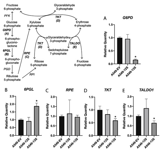 Relative expression of mRNA for pentose phosphate pathway genes in 13S and 12S expressing A549 cells. The mRNA expression for five genes encoding components of the pentose phosphate pathway were measured with qPCR (A–E). The pentose phosphate pathway relies on the products of glycolysis. Only the A549-13S cells displayed differential regulation of transcripts in this pathway. Of the five pentose phosphate pathway genes measured, three were downregulated (A,D,E) and one was upregulated in the A549-13S cells (B). H2AFY was used as a reference gene. Asterisks (*) indicate p < 0.05. n = three per group for all panels. G6PD, Glucose-6-phosphate dehydrogenase; 6PGL, 6-phosphogluconolactonase; PGD, Phosphogluconate dehydrogenase; RPE, Ribulose-5-phosphate-3-epimerase; RPI, Ribose 5-phosphate isomerase; TKT, Transketolase; TALDO, Transaldolase; PFK, Phosphofructokinase.