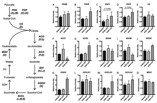 Relative expression of mRNA for tricarboxylic acid cycle genes in 13S and 12S expressing A549 cells. (A–O) The mRNA expression for 15 genes encoding components of the tricarboxylic acid (TCA) cycle were measured with qPCR. A549-13S cells displayed upregulated mRNA levels of enzymes involved in the TCA cycle. A549-13S cells had statistically significant upregulation of transcripts encoding six enzymes involved in the TCA cycle (B,G,J,K,M,N) and downregulation of two TCA cycle enzyme encoding transcripts (F,I). In contrast, A549-12S cells did not exhibit any statistically significant differences in TCA cycle transcript expression compared to the A549-EV cells. The geometric mean of two reference genes, H2AFY and ACTB was used. Asterisks (*) indicate p < 0.05. n = three per group for all panels. PDH, pyruvate dehydrogenase; PDP, Pyruvate dehydrogenase phosphatase; CS, Citrate synthase; ACO, Aconitase; IDH, Isocitrate dehydrogenase; OGDH, Oxoglutarate dehydrogenase; SUCLG1, Succinate-CoA ligase GDP/ADP-forming subunit alpha; SUCLG2, Succinate-CoA ligase GDP-forming subunit beta; SDH, Succinate dehydrogenase; FH, Fumarate hydratase; MDH, Malate dehydrogenase.
