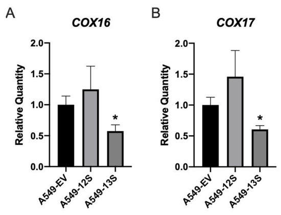 An upregulation of genes involved in the TCA cycle may allow for increased glutaminolysis or anaplerotic pathways rather than impacting cellular respiration. This would likely be reflected in a decrease in the expression of cellular respiration genes, despite the upregulation of TCA cycle genes. We determined the expression levels of two transcripts that encoded components of cellular respiration complex IV, cytochrome C oxidase assembly factor COX16 (COX16) mRNA (Figure 5A) and cytochrome C oxidase copper chaperone COX17 (COX17) mRNA (Figure 5B). The expression of both COX16 and COX17 was significantly lower in A549-13S cells. This paralleled the decreased oxygen consumption rate observed in A549-13S cells (Figure 1B). There were no differences in the expression of these two genes in A549-12S cells when compared to A549-EV cells.