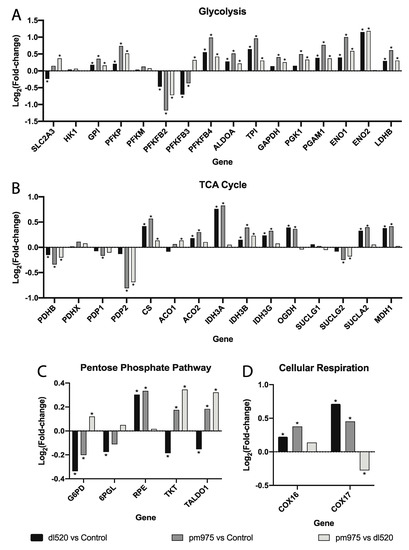 RNAseq analysis of metabolic genes from IMR-90 lung fibroblasts infected with either dl520, pm975 or an E1A-deleted HAdV-5 control virus. (A) RNA expression of glycolytic enzyme-encoding transcripts was often greater in pm975 infected cells than dl520 infected cells. However, dl520 infected cells also expressed glycolytic genes at consistently higher levels than in an E1A-deleted control HAdV-5 infection. (B) RNA expression of transcripts encoding TCA cycle enzymes, more highly up- or downregulated in pm975 infected cells when compared to dl520 infected cells. (C) Transcripts encoding pentose phosphate pathway intermediates in the non-oxidative pentose phosphate pathway branch are more highly upregulated in pm975 infected cells than in dl520 infected cells. (D) Both COX16 and COX17 transcripts, which encode components of the TCA cycle, are upregulated in both pm975 and dl520 infected cells, although to a lesser extent in the pm975 infection. Asterisks (*) indicate an adjusted p-value < 0.05. n = two per group for all panels. Gene names are defined in Figure 2, Figure 3, Figure 4 and Figure 5.