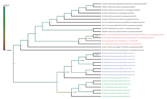 Phylogenetic analysis of the complete genomes of our eight MERS-CoV isolates and representative viruses of the genus Betacoronavirus. The new eight isolates are in blue, other MERS-CoV strains in green, and 2019-nCoV in red. The numbers at nodes represent the posterior probabilities of their clustering.