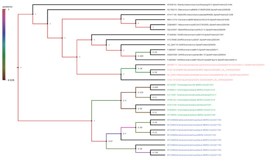 MERS-CoV is a zoonotic virus for which ongoing studies indicate major roles in transmission for direct contact with live camels and with humans having symptomatic MERS [27,28,29], with dromedary camels being considered intermediate hosts that are the main source of human infections. The second largest outbreak to date occurred in Saudi Arabia, and MERS-CoV is widespread among humans and camels in the Gulf countries [30], where it remains a potential hazard to regional and global health and welfare. The present study seeks to determine the evolutionary relationships between eight new MERS-CoV isolates obtained from Arabian camels in different regions of Saudi Arabia and 23 other previously sequenced betacoronavirus strains, based on phylogenetic trees constructed with BEAST for the complete viral genome and the spike protein.