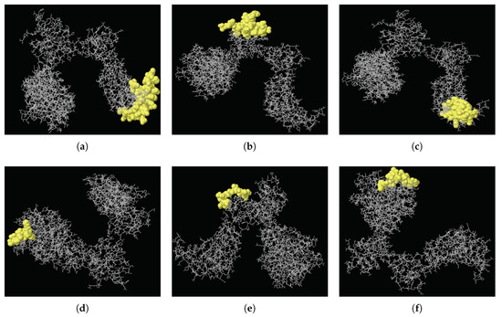 B cell epitopes are significant in the defense of the immune system against viral diseases, allowing B cells to identify different viral infections and activate responses against them. There has been many studies aiming to design MERS-Cov vaccine [24,25,26]. In this study, epitope analysis of MERS-CoV showed that the MERS-CoV spike protein has 24 discontinuous regions in total, from which just six epitopes with score values of >0.8 could be selected. The higher the score, the greater the potential of a true discontinuous epitope; the highest probability obtained was 0.898. Table 2 details the peptides of these high-scoring discontinuous epitopes and their sequence locations, epitope lengths, and associated scores. Their positions on the 3D structure of the MERS-CoV spike protein (PDB ID: 5X5F) are illustrated in Figure 3.
