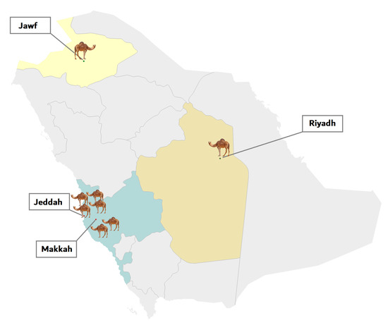 Geographical distribution of dromedaries in Saudi Arabia infected with MERS-CoV viruses that were isolated in the present study. The number of dromedaries corresponds to the number of isolates from the sampling location.