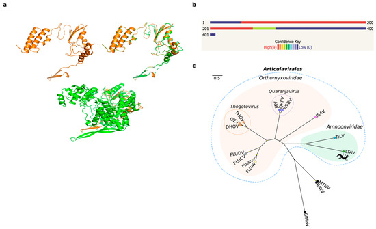 Protein structure prediction and phylogenetic relationships of Lauta virus (LTAV). (a) A 3D model prediction of the RdRp subunit PB1 of LTAV (top left). Protein structure superposition in the aligned region between the predicted model for LTAV and the RdRp (PB1 gene) of influenza A virus (FLUAV) (top right). Protein structure superposition of the predicted model for LTAV and the entire RdRp subunit of FLUAV (bottom). The protein structure predicted for LTAV is displayed in orange and that of FLUAV in green. (b) Confidence summary of residues modelled. (c) Maximum likelihood tree depicting the phylogenetic relationships between LTAV and TiLV within the family Amnoonviridae, order Articulavirales. Families are indicated with colored filled bubbles. Tip labels are colored according to genus. Genera comprising multiple species are indicated with unfilled bubbles. Support values >= 95% UFBoot and 80% SH-aLRT are displayed with yellow circle shapes at nodes. Alphainfluenzavirus (FLUBA); Betainfluenzavirus (FLUBV); Deltainfluenzavirus (FLUDV); Gammainfluenzavirus (FLUCV); Dhori thogotovirus (DHOV); Oz virus (OZV); Thogoto thogotovirus (THOV); Quaranfil quaranjavirus (QRFV); Wellfleet Bay virus (WFBV); Johnston Atoll quaranjavirus (JAV); Salmon isavirus (ISAV); Tilapia tilapinevirus (TiLV); Lauta virus (LTAV; gecko symbol); Blueberry mosaic-associated virus (BIMaV); Montano orthohantavirus (MTNV); Bayou orthohantavirus (BAYV).