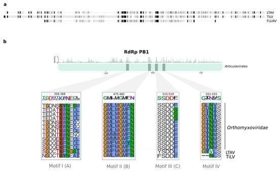 Conserved motifs in the RdRp subunit PB1 from the order Articulavirales. (a) Comparison of the Lauta virus RdRp sequence with the full-length PB1 sequence of TiLV and FLUAV. The gradient from black to light grey indicates the level of sequence similarity in the alignment. Highly conserved positions are shown in black. (b) Top panel shows the mean pairwise identity over all pairs in the column across the multiple sequence alignment among members of the order Articulavirales. Sequence motifs are shown with grey bars. The bottom panel depicts a magnified view of individual motifs. Letters in parenthesis denote the A–G RdRp motif nomenclature. The original amino acid residue position and standard logos are displayed in the top of each motif; the size of each character represents the level of sequence conservation. Amino acid residues in the alignment are colored according to the Clustal coloring scheme.