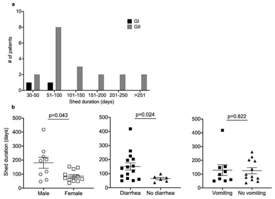 A subset of 21 infections was characterized by chronic virus shedding for >30 days. The number of patients and duration of virus shedding (a) varied for GI and GII infections, but most patients shed for <100 days. (b) An exploratory analysis of variables associated with longer shedding implicated male sex and the presence of diarrheal symptoms, but not vomiting, as significant. Statistical difference between groups was determined by the Mann-Whitney U-test, with a 2-sided p-value of <0.05 denoting significance.
