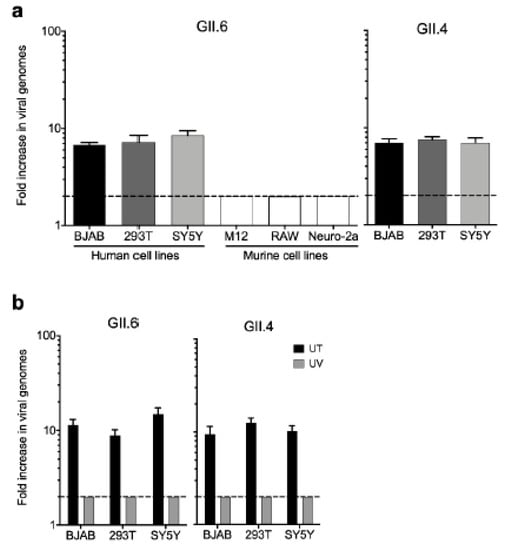 We recently discovered serendipitously that HEK293T cells support human norovirus replication at levels comparable to those in BJAB B cells when infected with GII.6- or GII.4-positive stool inocula collected from acutely infected patients (Figure 4a). Because HEK293T cells are neuronal-like [], we investigated whether other neuronal cells would also support viral replication. Indeed, viral genome copy number increases were comparable in SY5Y cells (Figure 4a). To bolster our finding that these cell lines support human norovirus replication, we tested a panel of murine cell lines that we anticipated to be resistant to human norovirus infection, considering the strict species specificity of noroviruses. Consistent with this, we observed no increase in viral genome copy numbers when murine M12 B cells, RAW264.7 macrophages, or Neuro-2A neuronal cell lines were inoculated with the same GII.6-positive stool (Figure 4a). Furthermore, ultraviolet treatment of GII.6- and GII.4-positive acute stools completely ablated virus infectivity in BJAB, HEK293T, and SY5Y cells (Figure 4b).