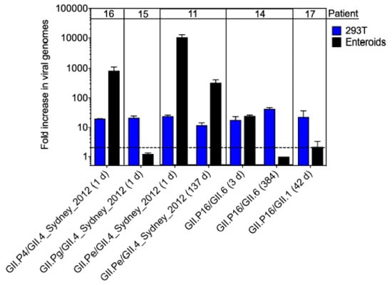 Because intestinal enteroids also support human norovirus infection [,], we tested a subset of samples (n = 7) from the chronic shedders that replicated most efficiently in HEK293T cells for infectivity in enteroids. Data are reported as fold-increase of viral genome copy numbers over a 3-day infection (Figure 6). A range of patterns was observed. Three of the 7 patient samples did not replicate efficiently in enteroids (<5-fold increase in genome copies), whereas 3 other samples replicated more efficiently in enteroids than in HEK293T cells (>100-fold increase in genome copies). The 7th sample replicated to comparable levels in both in vitro systems. Together, these data (i) support our findings in HEK293T cells that infectious human norovirus can be shed from chronically infected patients, (ii) confirm prior studies that demonstrated variability in replication using the enteroid model [,], and (iii) reveal virus- or stool-dependent variability in replication in different cell types.