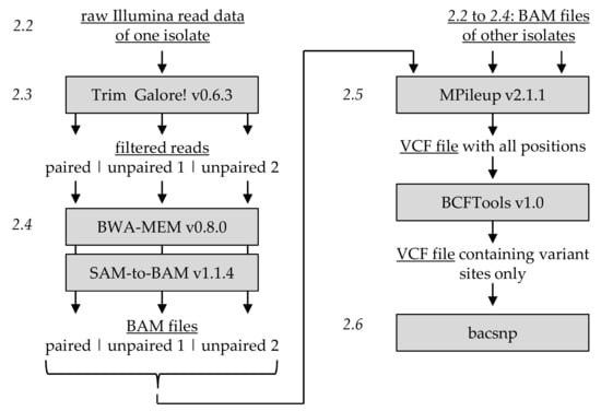 Workflow of processing Illumina sequencing data for the detection of variable single nucleotide polymorphisms (SNP) positions. Steps 2.2 to 2.6 refer to the corresponding paragraphs in the text. Steps 2.2 to 2.4 were applied separately for each sequenced isolate. All binary alignment mapping (BAM) files of all isolates were processed commonly using MPileup (step 2.5) to detect variant sites and to analyze their specificities and frequencies (step 2.6).