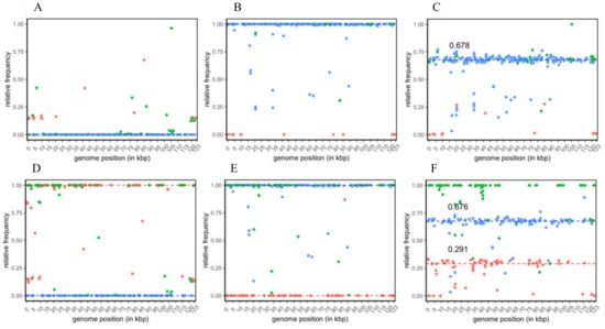 The raw SNP data sets were filtered to increase the stringency for further SNP specificity assignment and quantitative analysis. For the analysis based on CpGV-M and CpGV-E2 as references, the total number of SNP positions decreased to 277 and 300, respectively, of which most filtered SNP positions were only located in repeat regions of their reference. From the 277 SNP positions of the CpGV-M reference-based analysis, 223 were specific solely to CpGV-S, 15 were specific to CpGV-M, and 39 were group specific for both isolates (Figure 2A–C). For the majority of CpGV-S-specific SNP positions, their relative frequencies (ƒS) grouped around three medians in the three analyzed isolates: (i) ƒS = 0 in CpGV-M (Figure 2A), (ii) ƒS = 1 in CpGV-S (Figure 2B) and (iii) ƒS = 0.678 in CpGV-0006 (Figure 2C). In the sequenced isolates CpGV-S and CpGV-0006, the frequencies of a minority of CpGV-S specific SNPs scattered below the calculated median (Figure 2B,C).