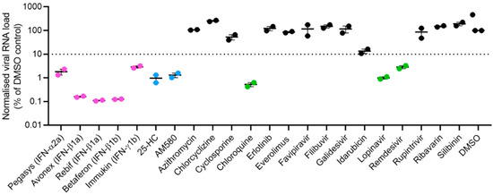 Primary screening of 22 antiviral agents with broad-spectrum antiviral activities against coronaviruses and/or other viruses. VeroE6 cells were infected with SARS-CoV-2 (multiplicity of infection = 0.001) and treated with the fixed concentration of 10,000 IU/mL for each IFN or 20 µM for each of the other antiviral agents. The cell culture supernatants were collected at 72 h post-inoculation for viral load quantitation by quantitative reverse transcription-polymerase chain reaction. The experiments were performed in triplicate. The cut-off value of ≥90% inhibition (i.e., ≥1 log10 copies/mL reduction when compared with the DMSO control) was used to select the antiviral agents for further evaluation (magenta dots = recombinant interferons, blue dots = lipogenesis modulators, and green dots = antiviral agents recently reported to be active against SARS-CoV-2). Abbreviation: 25-HC, 25-hydroxycholesterol; DMSO, dimethyl sulfoxide.