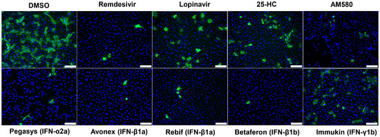 SARS-CoV-2 nucleocapsid (N) antigen expression assay. Immunofluorescence staining of SARS-CoV-2-N antigens (labelled with in-house rabbit antiserum against SARS-CoV-2-N in green) and cell nuclei (labelled with 4′,6-diamidino-2-phenylindole in blue). Fixation and staining was performed after each recombinant IFN (3000 IU/mL) or antiviral agent (20 µM) was used to treat the SARS-CoV-2-infected compound (multiplicity of infection = 0.1) VeroE6 cells for 24 h. Scale bar = 100 µm.