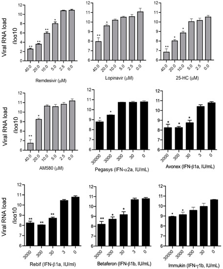 To quantify the anti-SARS-CoV-2 activity of the identified antiviral agents in the primary screening and the viral N antigen expression assay, SARS-CoV-2 viral load reduction assay by qRT-PCR was conducted to determine the SARS-CoV-2 RNA copies released in the cell culture supernatant with or without antiviral agent treatment. As show in Figure 3, the mean baseline viral load in the cell culture supernatants without any antiviral agent was about 11.2 log10 copies/mL. There was dose-dependent and significant (p < 0.05) reduction in viral load of >50% as compared to the baseline in cell culture supernatants inoculated with each of the eight antiviral agents. As controls, remdesivir and lopinavir achieved 8.3 log10 copies/mL and 3.2 log10 copies/mL reduction in viral RNA load, respectively, at a concentration of 40 µM. In comparison, 25-hydroxychloestero and AM580 achieved 4.4 log10 copies/mL and 4.2 log10 copies/mL reduction in viral RNA load, respectively, at the same antiviral agent concentration. Consistent with the primary screening results, IFN-β1a IFN-β1b demonstrated more potent anti-SARS-CoV-2 activity than IFN-α2a and IFN-γ1b in the viral load reduction assay. At a concentration of 3000 IU/mL, Avonex (IFN-β1a), Rebif (IFN-β1a), and Betaferon (IFN-β1b) respectively achieved 3.1 log10 copies/mL, 2.8 log10 copies/mL, and 3.0 log10 copies/mL reduction in viral RNA load, whereas Pegasys (pegylated IFN-α2a) and Immukin (IFN-γ1b) achieved only 1.6 log10 copies/mL and 1.5 log10 copies/mL reduction in viral RNA load. At a higher concentration of 30,000 IU/mL, Pegasys and Immukin achieved modestly higher reduction in viral RNA load (2.1 log10 copies/mL and 1.7 log10 copies/mL, respectively).