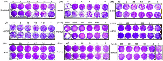 SARS-CoV-2 HKU-001a (GenBank accession number: MT230904) was isolated from the nasopharyngeal aspirate specimen of a laboratory-confirmed COVID-19 patient in Hong Kong [14]. The virus was propagated in VeroE6 cells and kept at −80 °C in aliquots. Plaque forming unit (PFU) and TCID50 assays were performed to titrate the cultured virus as we described previously [14]. VeroE6 (ATCC® CRL-1586™) cells were purchased from ATCC (Manassas, VA, USA) and maintained in Dulbecco’s modified eagle medium (DMEM, Gibco, Carlsbad, CA, USA) culture medium supplemented with 10% heat-inactivated FBS (fetal bovine serum, Gibco), 50 U/mL penicillin, and 50 µg/mL streptomycin as previously described [14]. All experiments involving live SARS-CoV-2 followed the approved standard operating procedures of the Biosafety Level 3 facility at the Department of Microbiology, The University of Hong Kong [15]. The recombinant IFNs were obtained from the following sources: Pegasys (Roche, Basel, Switzerland), Avonex (UCB, Brussels, Belgium), Rebif (EMD Serono, Inc. Rockland, MA, USA), Betaferon (Bayer Schering Pharma, Berlin, Germany), and Immukin (Boehringer Ingelheim, Ingelheim am Rhein, Germany). All other antiviral agents were purchased from MedChemExpress (Monmouth Junction, NJ, USA).
