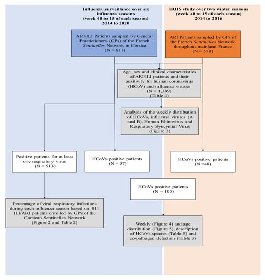 Nasopharyngeal samples were collected: i) as part of the community influenza surveillance conducted in collaboration with the French Sentinelles Network from patients seen in general practice, consulting for influenza-like illness (ILI) or ARI (for patients aged >65 years old) during six influenza seasons (week 40 to 15 of each season) from 2014 to 2020 in Corsica, France; and ii) from ARI patients enrolled throughout mainland France by general practitioners (GPs) of the French Sentinelles Network, during an epidemiological study of the risk factors for seasonal influenza (IRIIS study; 2014–2016 influenza seasons (week 40 to 15)) [20]. Notably, to ensure that the selection of ILI/ARI patients remained random, each GP was required to include, each week, the first two patients unrelated to one another, consulting within <48 h since symptom onset and consenting to provide a nasopharyngeal specimen. Each patient could be included only once a year (Table 1 and Figure 1). The surveillance uses a specific definition of ILI for patient recruitment: sudden onset of fever >39 °C with myalgia and respiratory signs, diagnosed by the physician. The case definition of ARI was “any person with a sudden onset of symptoms and at least one of the following four systemic symptoms: fever or feverishness, malaise, headache, myalgia, and at least one of the following three respiratory symptoms: cough, sore throat, or shortness of breath.”