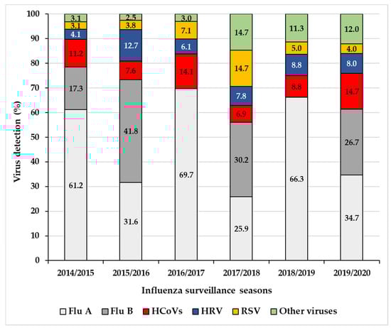 The seasonal distribution per week of HCoV, influenza viruses (A and B), RSV, and HRV was studied in 1389 ILI/ARI patients (Table 1 and Figure 3). Among the 1389 patients, 59.6% (n = 828) were positive for at least one respiratory virus, of which 39.6% (n = 328) were positive for influenza A virus, 25.6% (n = 212) for influenza B virus, and 12.6% (n = 105) for HCoVs. HCoVs were detected during the entire winter season (weeks 48–14), with the highest number of HCoVs detected in week 6 (Figure 3). Notably, week 6 had a decrease in influenza A virus detection (Figure 3). Since the number of HCoVs detected by species per season was low, the seasonality of HCoVs was established from all viruses detected per week over the six influenza seasons. The HCoV peak trend detection among week 4 to 7 was clearly observed during three influenza seasons (2014/2015; 2015/2016; 2019/2020).