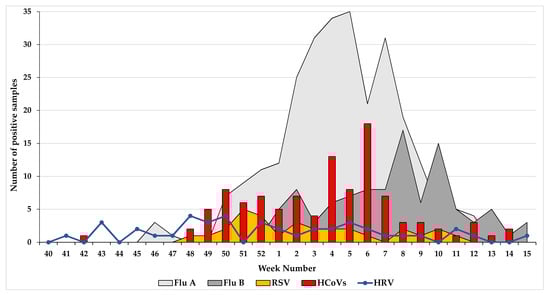Analysis of the weekly distribution of Human Coronaviruses (HCoVs), influenza viruses (A and B), RSV, and HRV. Flu A: Influenza virus A; Flu B: Influenza virus B; HCoVs: Human coronaviruses; HRV: Human rhinovirus; RSV: Respiratory syncytial virus.