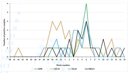 Similar to other countries in the northern hemisphere, we reported a winter seasonal prevalence pattern for the four HCoV strains [23], with the highest number of cases presenting in February [9,24]. In our study, the peak in February was attributable to the 229E, NL63, and HKU1 strains, whereas the OC43 strain had peaks in December. Overall, among the HCoV-positive patients in this study, the OC43 strain was the most commonly detected virus, followed by the NL63, HKU1, and 229E strains, in agreement with previous studies [9,25,26]. HCoV-OC43 is routinely associated with ~5% of acute respiratory infections and was the most commonly detected virus in HCoV patients [27,28,29]. A seroconversion study in hospitalized children reported that HCoV-OC43 and HCoV-NL63 might induce cross-immunity, and therefore reduce the subsequent number of clinically identified HCoV-HKU1 and HCoV-229E infections [30].