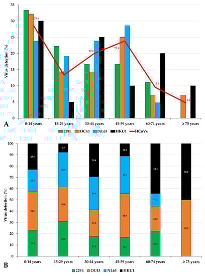 Age distribution of patients with human coronavirus infection (A) and the distribution of coronavirus subtype infections in the different age groups (B).