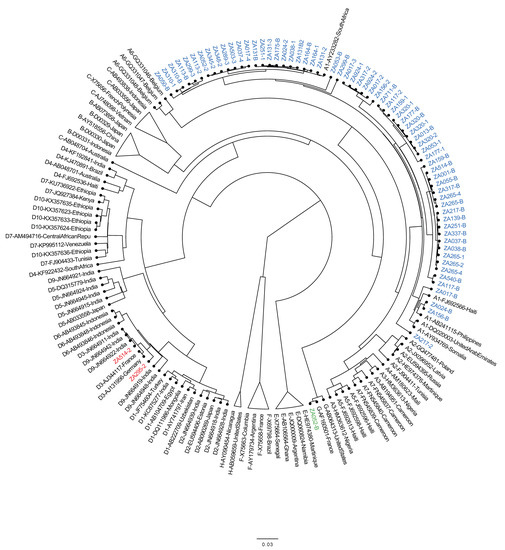 Phylogenetic analysis of HBV polymerase open reading from South Africans with occult or chronic HBV. Sequences from this study are indicted by “ZA”, while references are indicated by subgenotype–accession number–country. Genotype A sequences from this study are highlighted in blue, genotype D in red, and genotype G in green.
