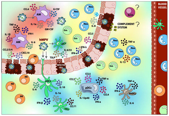 The innate immune response is the first line of defense against virtually all kinds of pathogens, including those of viral natures. Within this complex response, innate immunity plays a key role in the control of infections given its fast and antigen non-specific responses against pathogens. The most relevant innate immune response components in the contexts of hRSV and hMPV infections are neutrophils, eosinophils, macrophages, dendritic cells, natural killer cells, and the complement system. How each of these cells are activated and the immune pathology, or contribution for disease resolution that results from their recruitment, is discussed below.