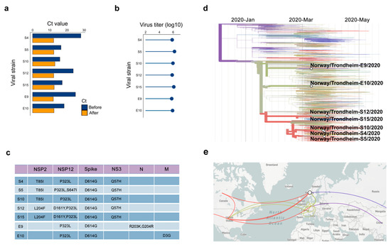 We isolated seven SARS-CoV-2 strains from 22 NPS samples of COVID-19 patients using Vero-E6 cells. The RT-qPCR cycle threshold (Ct) values were 18–20 before and 13–15 after propagation of the viruses in Vero-E6 cells (Figure 1a,b). We sequenced seven strains and found that the sequences differed from the reference hCoV-19/Wuhan/WIV04/2019 strain by a few missense mutations (Figure 1c). Phylogenetic analysis showed a close relationship between the strains (Figure 1d). In cross-referencing our sequence data with the pathogen-tracking resource NextStrain.org, we determined that the SARS-CoV-2 strains isolated in Trondheim originated from China, Denmark, the USA and Canada (Figure 1e).