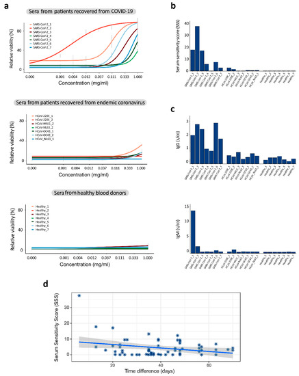 We evaluated the neutralization capacity of seven serum samples obtained from patients recovered from COVID-19. We also used sera from patients recovered from endemic coronavirus infections and from healthy blood donors as controls. Five samples from patients recovered from COVID-19 had serum sensitivity scores (SSS) > 5 and rescued >50% cells from virus-mediated death at 1 mg/mL (Figure 2a,b). Notably, that serum from a recovered patient with SSS = 7.2 neutralized all seven SARS-CoV-2 strains (Figure S3).