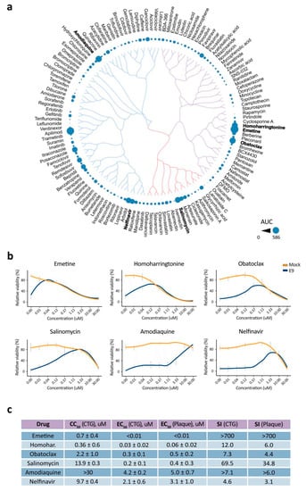 - Andersen, P.I.; Krpina, K.; Ianevski, A.; Shtaida, N.; Jo, E.; Yang, J.; Koit, S.; Tenson, T.; Hukkanen, V.; Anthonsen, M.W.; et al. Novel Antiviral Activities of Obatoclax, Emetine, Niclosamide, Brequinar, and Homoharringtonine. Viruses 2019, 11, 964. [Google Scholar] [CrossRef]