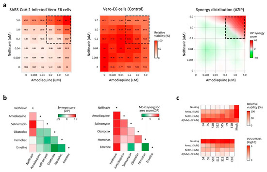 To test for potential synergism among the validated hits, we treated cells with varying concentrations of a two-drug combination and monitored the cell viability (Figure 4a). The observed drug combination responses were compared with the expected combination responses calculated by means of the zero-interaction potency (ZIP) model [27,33]. We quantified synergy scores, which represent the average excess response due to drug interactions (i.e., 10% of cell survival beyond the expected additivity between single drugs has a synergy score of 10). We found that combinations of nelfinavir with salinomycin, amodiaquine, homoharringtonine and obatoclax, as well as the combination of amodiaquine and salinomycin, were synergistic (most synergistic area scores >10; Figure 4b). Moreover, the nelfinavir-amodiaquine treatment was effective against all seven SARS-CoV-2 strains (Figure 4c). Thus, we identified synergistic drug combinations against SARS-CoV-2 infections.
