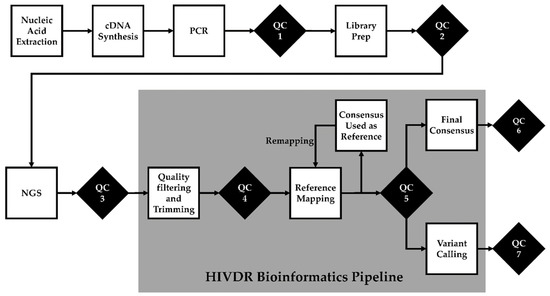 Quality control (QC) checks in NGS-based HIV drug resistance testing. QC1: post-PCR quality check. QC2: library preparation quality check. QC3: post-sequencing run quality check. QC4: bioinformatics pre-processing quality check. QC5: post-reference mapping quality check is performed only after the final remapping. QC6: cross-contamination quality check. QC7: “bad” mutation quality check.