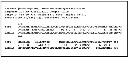 Best match from the BlastP similarity search output of the entire SARS-CoV-2 nsp3 protein (1935 residues) against the human proteome subset of the NR database. This unique match precisely corresponds to the ADP-ribose binding site, central to the viral macrodomain defined by previous structural studies [11].