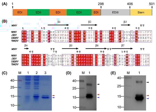 The E sequence (GenBank Accession No. MK542820) of TMUV Y was employed to predict the boundaries of EDIII with the conserved domain database (CDD) search [28]. The secondary structure of the EDIII protein was predicted by alignment with those of Dengue virus (DENV; PDB Accession No. 2JSF), Japanese encephalitis virus (JEV; GenBank Accession No. ABC79599.1), and West Nile virus (WNV; PDB Accession No. 1S6N) with Clustal Omega (https://www.ebi.ac.uk/Tools/msa/clustalo/) as well as the ESPript 3.0 analysis (http://espript.ibcp.fr/ESPript/ESPript/). Molecular mass (Mr) of the EDIII proteins was predicted with ProtParam (https://web.expasy.org/protparam/).