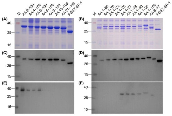 To identify the epitope recognized by MAb 12F11, we expressed 17 N-terminal GST-fused truncated rEDIII proteins. All 17 truncated rEDIII proteins were expressed in E. coli successfully (Figure 5A,B), which were further confirmed by Western blot assay with anti-GST MAb (Figure 5C,D). 12F11 recognized the recombinant proteins with N-terminal truncations of 1–7 amino acids, including AA 2–109, AA 4–109, AA 6–109, and AA 8–109 (Figure 5E), and those with C-terminal truncations of 9–32 amino acids, including AA 1–100, AA 1–90, AA 1–80, AA 1–78, and AA 1–77 (Figure 5F). The MAb did not recognize the peptides with N-terminal truncations of 8–20 amino acids, including AA 9–109, AA 10–109 and AA 21–109 (Figure 5E), and those with C-terminal truncations of 33 to 49 amino acids, including AA 1–76, AA 1–74, AA 1–70, and AA 1–60 (Figure 5F). On this basis, we expressed the recombinant protein AA 8–77 in E. coli (Figure 5B,D). The recognition of the recombinant protein by 12F11 was confirmed by Western blot assay (Figure 5F).