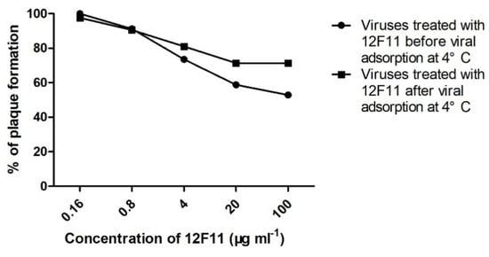 After the cells were washed three times with PBS, each culture was overlaid with 500 μL of overlay medium. Following incubation, fixation, and staining as described in PRNT, plaques were counted. The experiments were repeated for three times. In each experiment, a negative control was included, in which MAb was replaced with 100 μL of DMEM. Each experiment was repeated three times. The ability of MAb 12F11 to neutralize virus infectivity in pre-adsorption and post-adsorption inhibition experiments were measured by comparing the number of plaques formed in the MAb treatment group with the value obtained from the control group. The percentage of plaques formed in the presence of MAb (mean PFU obtained from the MAb treatment group/mean PFU obtained from the control group) was also calculated as reported previously [32].