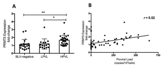 BLV PVL is an important index of the risk of BLV transmission and infectivity as well as disease progression [7,8,10,12,13]. To investigate the correlation between PRMT5 expression and BLV PVL, we collected blood samples from 62 cows which were asymptomatic and had not developed symptoms of lymphoma at the time of blood collection. First, we performed CoCoMo-qPCR-2 to calculate the BLV PVL, which was used to classify the cows into three groups: BLV-negative cattle (control group), BLV-infected cattle with a low-PVL (LPVL group), and BLV-infected cattle with a high-PVL (HPVL group). As described previously [9,15], a BLV-PVL of 10,000 copies/105 was used as a threshold to distinguish between the HPVL and LPVL groups. Next, we evaluated PRMT5 expression at the RNA levels by qRT-PCR. The mean fold-change in PRMT5 was 1.12 ± 0.62 in the control group, 1.18 ± 0.64 in the LPVL group, and 1.64 ± 0.62 in the HPVL group (Figure 1A). PRMT5 expression was significantly higher in the HPVL group than in the uninfected group (p = 0.0014) and LPVL group (p = 0.012) (Figure 1). Our results showed that PRMT5 was significantly overexpressed only in BLV-infected cattle with a high PVL, but not in those with a low PVL. Furthermore, a positive correlation was obtained between the BLV PVL and PRMT5 expression fold-change (r = 0.52) (Figure 1B).
