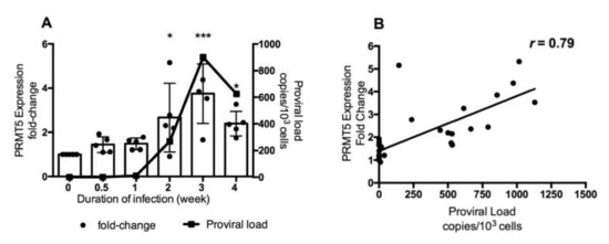 As shown in Figure 1, PRMT5 was upregulated only in BLV-infected cattle with a high PVL. To further investigate the role of PRMT5 in BLV infection in vivo, we examined whether PRMT5 is overexpressed in the early stage of BLV infection. Therefore, we performed experimental infection of five BLV-negative Japanese black calves carrying the susceptible alleles BoLA-DRB3*1601/1601, which are related to a high PVL in BLV infection [52] and we collected blood samples at different time points during the first month of infection (0, 0.5, 1, 2, 3, and 4 weeks). Next, we monitored BLV PVL and PRMT5 expression at each time point. The mean of BLV PVL was 0 copies/105 cells before infection (0 week), 34 copies/105 cells after 3 days, 1158 copies/105 cells after 1 week, 26,760 copies/105 cells after 2 weeks, 90,150 copies/105 cells after 3 weeks, and 62,440 copies/105 cells after 4 weeks (Figure 2a, line graph). The mean fold-change in PRMT5 was 1 before infection, 1.44 after 3 days, 1.48 after 1 week, 2.6 after 2 weeks, 3.7 after 3 weeks, and 2.3 after 4 weeks. The highest expression of PRMT5 was observed during the third week (fold-change = 3.74, p = 0.0008) and then the expression slightly decreased after 4 weeks (fold-change = 2.3, p = 0.01) (Figure 2A, bar graph). Interestingly, and consistently with the data shown in Figure 1A, a strong positive correlation was found between the fold-upregulation of PRMT5 and BLV PVL (r = 0.79) (Figure 2B). Thus, PRMT5 expression was upregulated in response to BLV infection and the level of upregulation was positively correlated with the BLV PVL. Moreover, PRMT5 upregulation began in an early stage of BLV infection rather than being established after a long period of proviral latency.