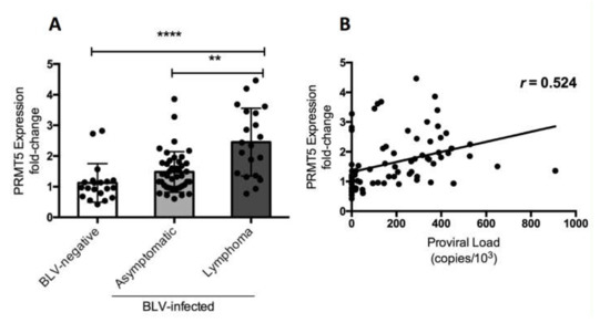 Finally, we investigated whether the change in PRMT5 expression in BLV-infected cattle occurred in the lymphoma stage of disease. We compared PRMT5 expression at the RNA level among three groups of cattle: 20 BLV-negative cattle, 42 BLV-infected but clinically normal cattle, and 20 BLV-infected cattle with lymphoma. The fold-change in PRMT5 expression was 1.12 ± 0.62 in BLV-negative cattle, 1.48 ± 0.66 in the asymptomatic group, and 2.45 ± 1.1 in the lymphoma group (Figure 3). This strongly indicates that PRMT5 upregulation continues until the lymphoma stage of BLV. Additionally, we confirmed the positive correlation between BLV PVL and PRMT5 expression fold-change (r = 0.524).