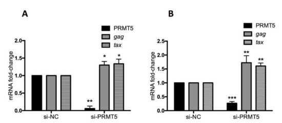 Effect of PRMT5 knockdown on BLV gene transcription. FLK-BLV (A) or PK15-BLV (B) cells were transfected with scramble siRNA (si-NC) or siRNA targeting PRMT5 (si-PRMT5) for 48 h for FLK-BLV or 72 h for PK15-BLV. BLV gene transcription (mRNA-gag and mRNA-tax) in addition to PRMT5 gene expression at the RNA level was evaluated by qRT-PCR. The ΔΔCT method was used to calculate the fold-change and GAPDH expression was used as an internal control. Error bars represent the standard deviation of three experiments. The p value was calculated using the Student’s t-test. The asterisk indicates a significant difference (* p ≤ 0.05, ** p ≤ 0.01, and *** p ≤ 0.001).