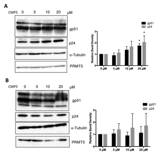 Next, we examined the effect of a pharmacological PRMT5 inhibitor on BLV protein expression. We used a small-molecule PRMT5 inhibitor (CMP5), which was described previously by Alinari et al. [46]. We examined the effect of CMP5 on FLK-BLV and PK15-BLV. FLK-BLV or PK15-BLV was cultured in fresh medium with or without 5, 10, or 20 µM of CMP5 for 48 h. Cell lysates were prepared and the viral protein expression levels of Env and Gag were evaluated by Western blotting analysis with anti-BLV gp51 Mab or anti-BLV p24 Mab. Consistently, CMP5 treatment enhanced the protein expression of both gp51 and p24 in a dose-dependent manner in FLK-BLV, showing significance at a concentration of 20 µM (Figure 6A). In contrast, in PK15-BLV, BLV expression was not significantly affected (Figure 6B). The bands corresponding to unprocessed Gag are shown in Figure S2C,D for FLK-BLV and PK15-BLV, respectively. These results also revealed that there was no defect in Gag processing after CMP5 treatment.