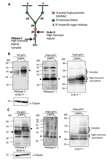Deglycosylation assay of BLV gp51 using PNGase F and endo H. (A) Schematic representation of PNGase F and Endo H sensitive bonds in the core of N-glycans. (B) FLK-BLV or (C) PK15-BLV were treated with Milli-Q water (CMP5−) or 20 µM CMP5 (CMP5+) for 48 h. Cell lysates were divided into three parts: one part was untreated (PNGase F−/Endo H−), the second part was deglycosylated by PNGase F (PNGase F+), and the third part was deglycosylated by Endo H (Endo H+). The cell lysates from the three conditions were subjected to Western blotting analysis with anti BLV gp51 (BLV2). α-Tubulin was used as a loading control. The data are a representation of at least three experiments. The positions of BLV gp51 protein with or without glycosylation, gp51 glycosylation pattern such as complex, and high-mannose and hybrid pattern, in addition to α-tubulin protein, are indicated.