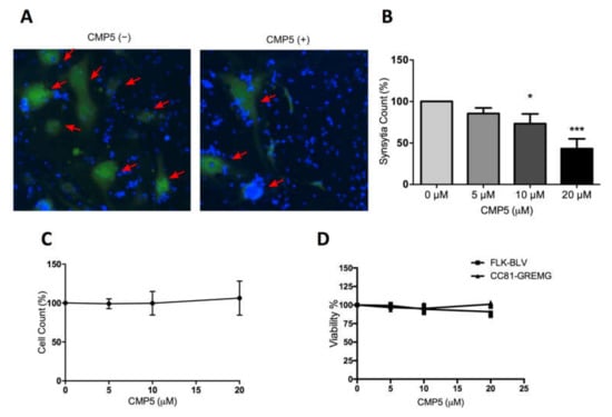 The luminescence syncytium induction assay (LuSIA) using CC81-GREMG cells was performed as described previously [51]. CC81 GREMG (1 × 105 cells) were co-cultured with 5 × 104 FLK-BLV cells in a 12-well plate in LuSIA medium, after which the indicated concentrations of CMP5 were added. After 48 h incubation, the cells were washed with PBS and fixed with 4% formaldehyde/PBS containing 10 µg/mL Hoechst 33342 (Thermo Fisher Scientific). The fluorescent syncytia were visualized by EVOS2 fluorescence microscopy (Thermo Fisher Scientific) and 9 fields of view in each well were automatically scanned with a 4× objective. Syncytia were detected by enhanced green fluorescent protein (EGFP) expression and counted using HCS Studio Cell Analysis software (Thermo Fisher Scientific).