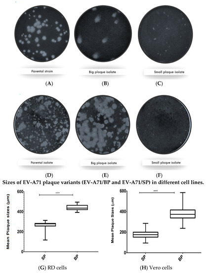 The ability of the two EV-A71 variants to form plaques of different morphologies was evaluated in both RD and Vero cells (Figure 2A,B). The big plaque variants produced the highest number of plaques (5.62 × 109 ± 6.40 × 108 PFU/mL) in RD cells but had lower viral titres in Vero cells (1.32 × 104 ± 603.5 PFU/mL) (Table 1). Lesser number of viral plaques (one log less) were observed for the small plaque variants in RD (6.35 × 108 ± 6.25 × 108 PFU/mL) and Vero cells (6.05 × 103 ± 455.5 PFU/mL). Since the ability to form plaques was reduced for the small plaque variant, viral growth was confirmed to be lower. Lower viral growth indicated lower virulence of the small plaque variant in RD and Vero cells.