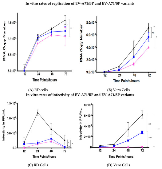 Both EV-A71 plaque variants had lower RNA replication rates in RD and Vero cells when compared to the wild type (EV-A71/WT) (Figure 3A,B). Overall, the EV-A71/WT (coloured in black) was observed to display significantly better rates of RNA replication when compared to the EV-A71/BP (coloured in blue) and EV-A71/SP variants (coloured in magenta). Meanwhile, the EV-A71/SP had the lowest rate of RNA replication when compared to both the EV-A71/WT and the EV-A71/BP variant. A sharp increase in the overall RNA rates of replication was observed from 12 hpi onwards in RD cells for the EV-A71/WT and the two plaque variants (Figure 3A). Subsequently, the rate of replication was observed to plateau at 72 hpi for the EV-A71/BP (1.29 × 108 viral copy number) while the replication of the EV-A71/SP (1.127 × 108 viral copy number) variant was observed to decline at 72 hpi. However, the EV-A71/WT continued to increase to 1.67 × 108 viral copy number at 72 hpi. Thus, the most significant difference was observed to occur between the overall viral RNA copy number of the EV-A71/SP variant and the EV-A71/WT (p < 0.01, one-way ANOVA).