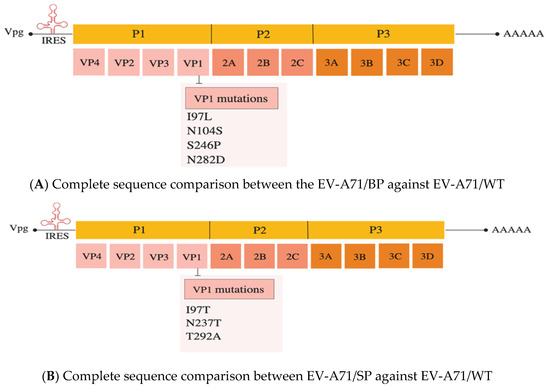(A) The VP1 amino acid sequence of the WT (parental EV-A71 strain) against EV-A71/BP. Significant non-synonymous mutations are: I97L, N104S, S246P and N282D. (B) The VP1 amino acid sequence homology of the WT (parental EV-A71 strain) and the EV-A71/SP was performed using Clustal Omega. Significant non-synonymous mutations are: I97T, N237T and T292A in the VP1 of the EV-A71/SP.