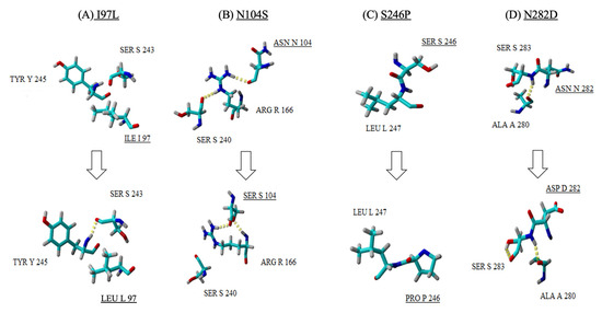 The big plaque variant, EV-A71/BP, was observed to carry four mutations (I97L, N104S, S242P and N282D) in its genome which caused differences in the 3D structure of the VP1 protein compared to the wild-type strain, EV-A71/WT. The mutation found at position 97 (EV-A71/SP: I97T and EV-A71/BP: I97L) is of significant interest as it is found in the BC loop of the VP1 protein and appears to be a recurrent and favoured spot for mutation in all EV-A71/BP and EV-A71/SP variants. In the EV-A71/WT, isoleucine (I) is found at position 97, but mutation to either threonine (T) or leucine (L) in the EV-A7/BP and EV-A71/SP variants, respectively, caused the formation of new hydrogen bonds (Figure 5A and Figure 6A). For instance, changing isoleucine (I) to threonine caused the latter to form a single hydrogen interaction with serine (S) at position 243. In the big plaque variant, a hydrogen bond was formed between serine (S) at position 243 and tyrosine (Y) at position 245. Moreover, despite the change in amino acid at position 104 (asparagine to serine) in the EV-A71/BP variant, no change in the characteristics of the amino acid was observed as both asparagine and serine belong to the same family of amino acids with polar uncharged side chains (Figure 5B). Interestingly in the EV-A71/WT, Asn104 (asparagine) initially formed a single hydrogen bond with Arg166 (arginine) which in turn interacted with Ser240 (serine). However, when asparagine (N) was substituted with Ser104 (serine) in the EV-A71/BP variant, it formed two hydrogen bonds with the Arg166 (arginine) and no interactions were observed with Ser240 (serine). At position 246 of the EV-A71/BP, the mutation induced a change in the characteristics of the amino acid such that a polar uncharged amino acid (serine) was replaced with the proline residue (Figure 5C). Of significant interest is the position at 282 near the N-terminus of the VP1 protein, whereby the polar uncharged asparagine (N) was replaced by aspartic acid (D) which has a negatively charged side chain. When asparagine (N) was found at position 282 in the EV-A71/WT, the neighbouring amino acid residue, Ser283, interacted via a single hydrogen bond with the Ala280. However, when mutation induced a change to aspartic acid (Asp282), the latter gained an additional hydrogen bond interaction with Ala280 (Figure 5D).