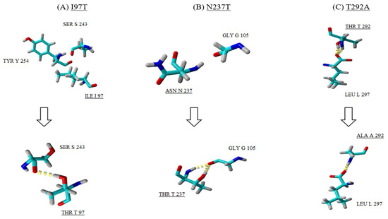 A close up view of the three mutations (A–C) observed in the EV-A71/SP structure (bottom row) when compared with the EV-A71/WT (top row). Amino acid substitutions are underlined and the hydrogen bonds are observed as yellow dotted lines.