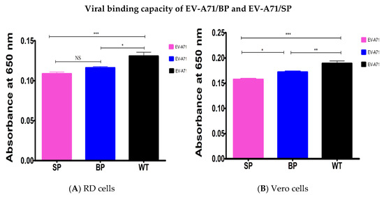 The results demonstrated that the viral binding of the EV-A71 plaque variants (EV-A71/BP and EV-A71/SP) was significantly reduced in both cell lines. In both host cells, the EV-A71/WT exhibited the highest binding ability compared to the EV-A71/BP and EV-A71/SP variants. Statistical analysis used was one-way ANOVA, p < 0.05.