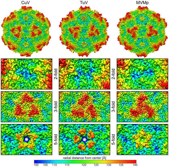 The CuV, TuV, and MVMp capsid surface. Surface representation of the atomic models built into the density maps of CuV, TuV, and MVMp [41] (PDB-ID: 1Z14) and radially colored (blue to red) according to distance from the capsid center, as indicated by the scale bar below. The entire capsid and close-up views of the icosahedral 2-, 3-, and 5-fold symmetry axes are shown. This figure was generated using UCSF-Chimera [27].